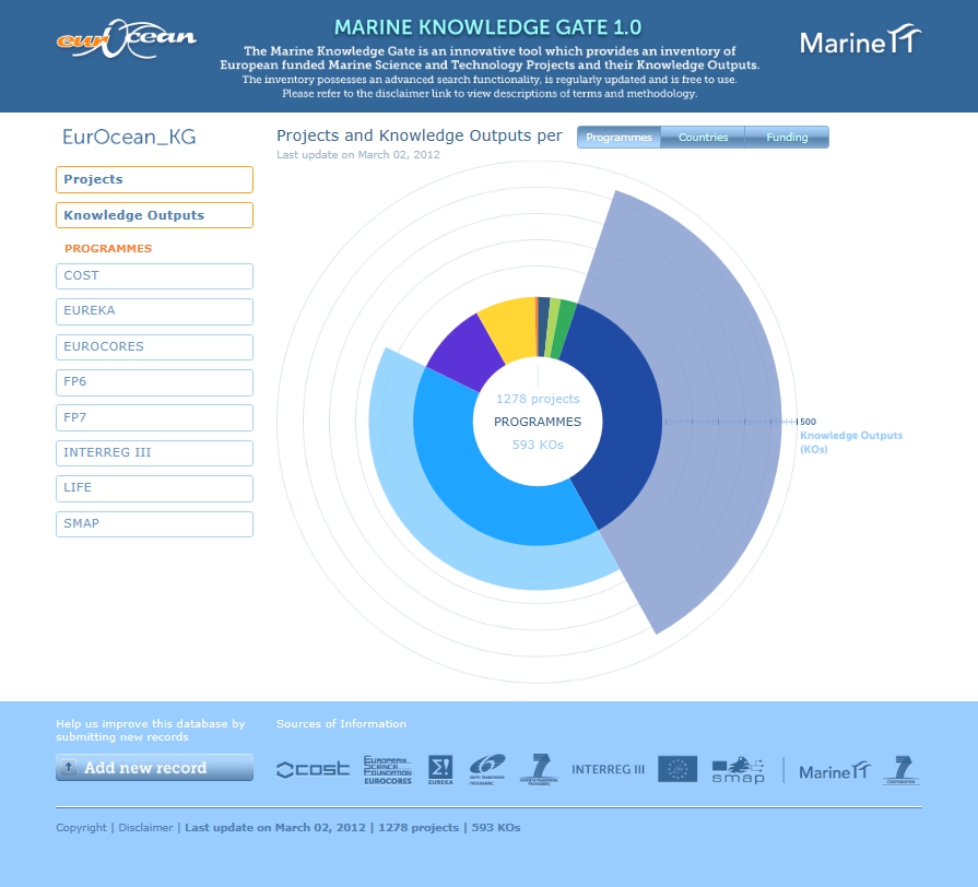 EurOcean_KG provides access to information on projects funded by COST, EUREKA, EUROCORES (ESF), INTERREG III, 6th Framework Programme (FP6), 7th Framework Programme (FP7), LIFE and SMAP, summing up a total of 1278 projects and 593 KOs (from FP6&FP7 projects) that are already available for consultation. It includes (according to official sources of information) a complete list of the FP6 funded marine projects as well as the midterm list of the FP7 funded marine projects.