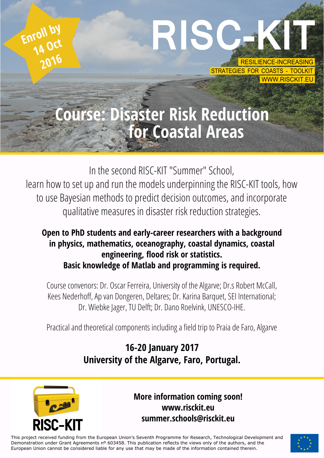 Enrollment for the second "summer" school will be open from 11 July until 14 October 2016. To apply for the course, please send a Letter of Motivation together with an up-to-date Curriculum Vitae to summer.schools@risckit.eu Applications will be evaluated by the conveners and the most suitable candidates will be offered a place on the course. Please note that places are limited and preference will be given to candidates based in Europe. For any questions regarding the summer schools, please email us at the address above, clearly stating Summer School II or Summer School Faro in the subject line.